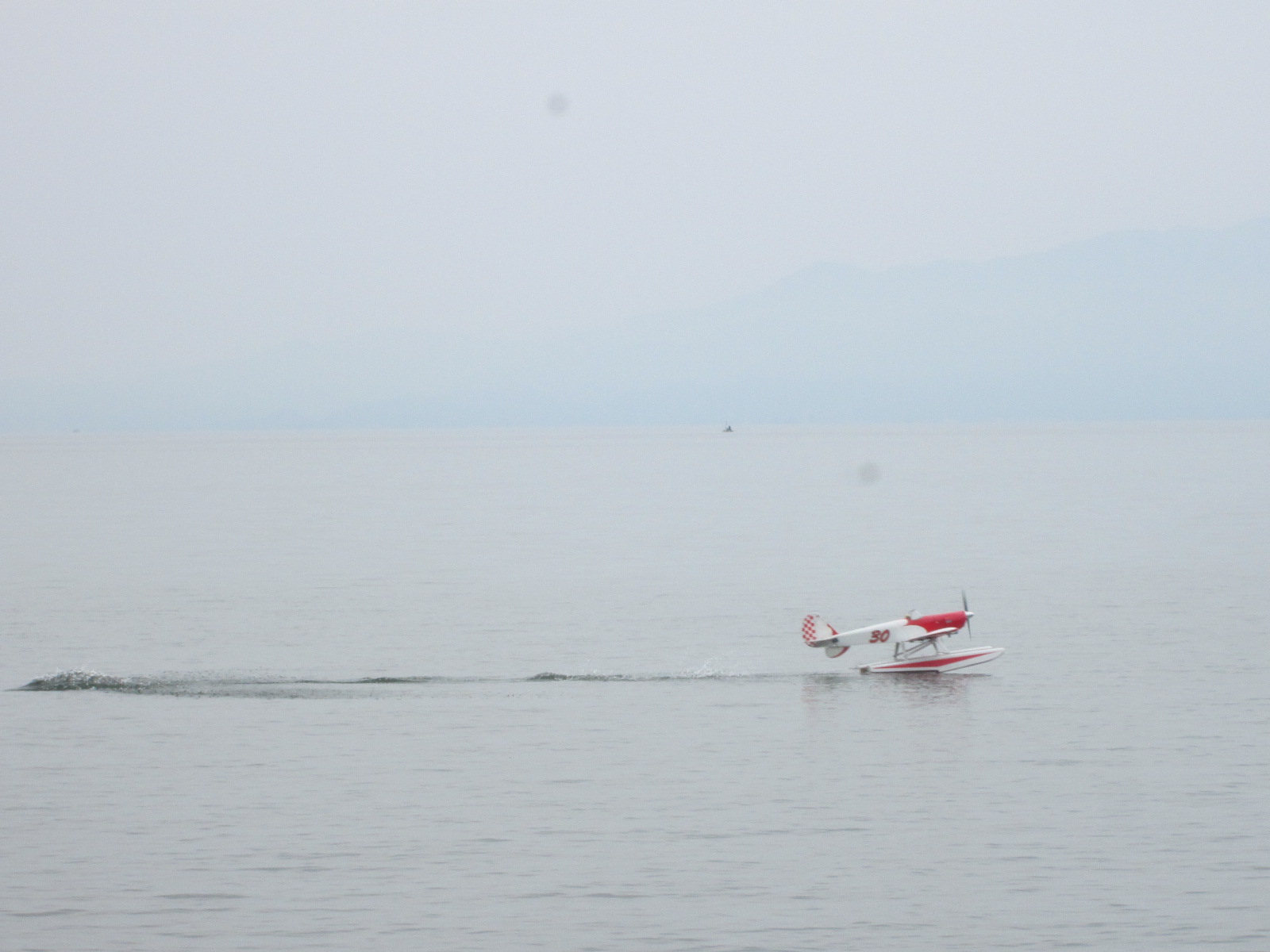 22.競技はフライインに移り、1番手車田機(スペース ウォーカー120)の着水進入です! |
