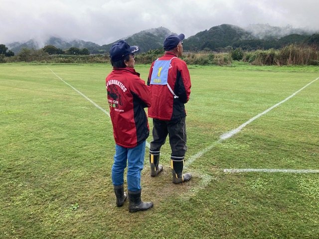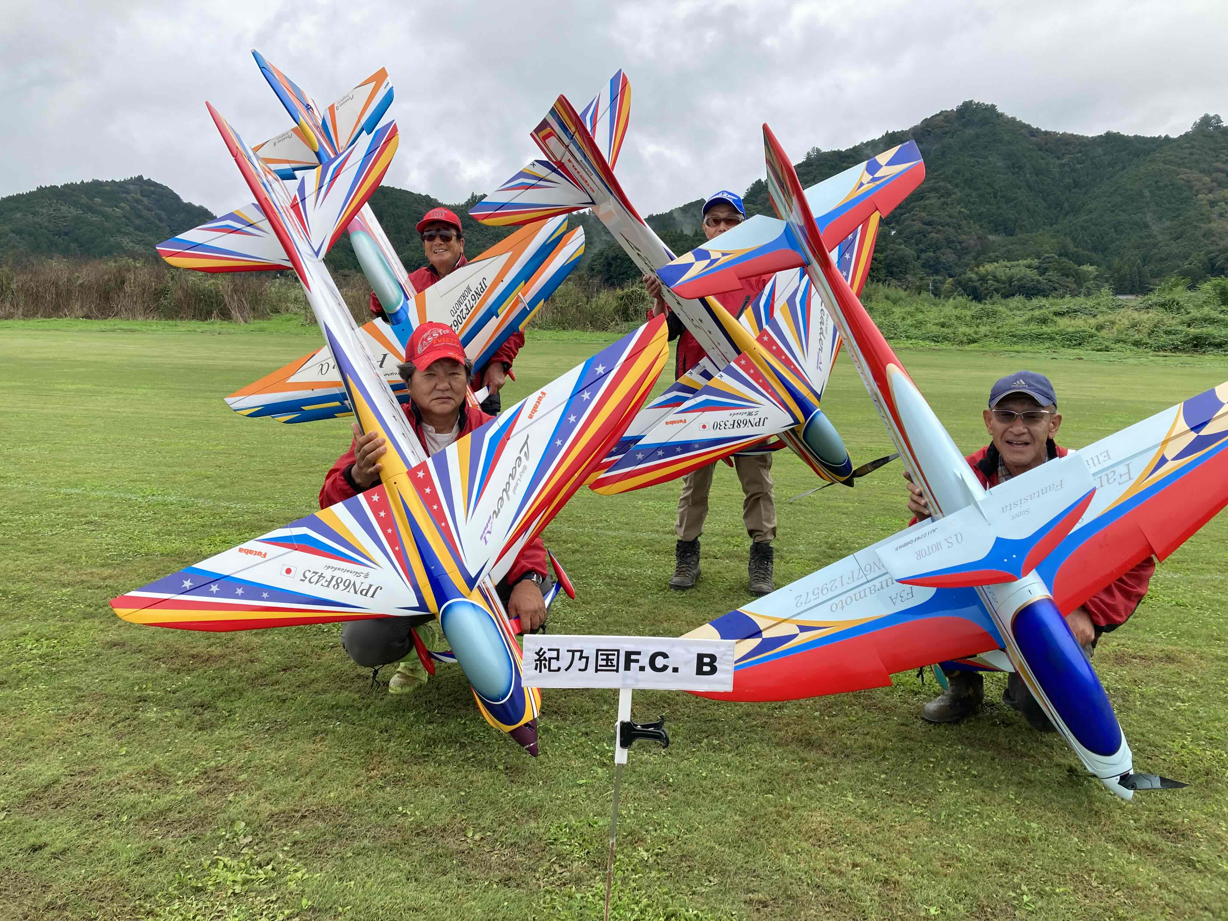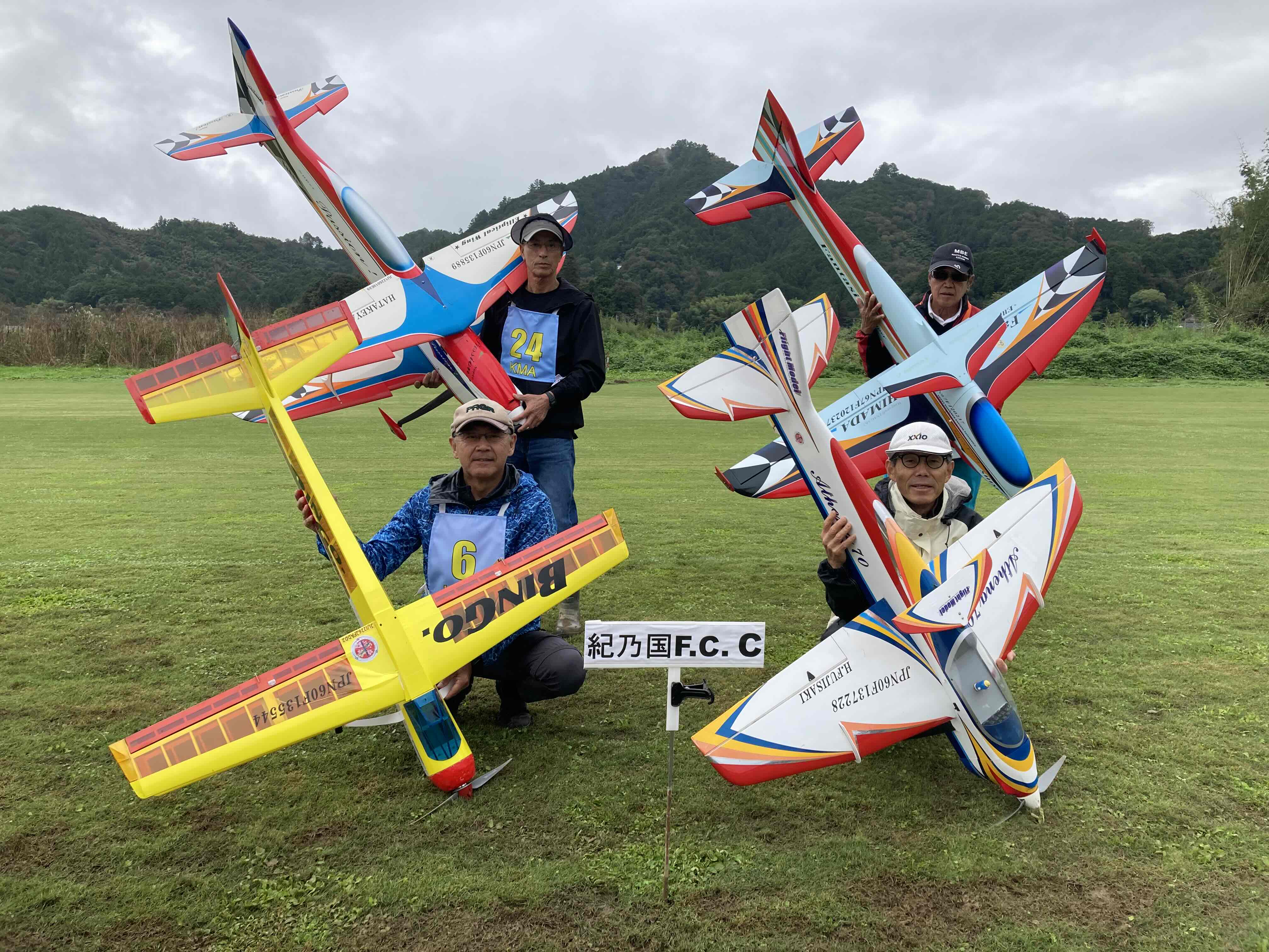 | 2025年KMAクラブ対抗曲技競技大会 10月26日 KMA福知山鬼の里模型飛行場 今年は9チーム36名のエントリーをいただきありがとうございました。 前日土曜日は、大会準備の為飛行場に行ってみると、7~8名のフライヤーが練習をされていました。お天気は概ね晴れで穏やかな天候でした。ただ明日は天気予報でも不安定な天候との予報で、開催出来るか気がかりです。 当日、大会会場に到着するとやはり雨模様で雨のやみまで開会式を済ませ、競技を開始する手はずでしたがウェザーチェックで上空に飛行機を上げたところ雲が低く機体の視認性が確保できない為暫くの待機となりました。その後何度か上空確認を行ない競技を開始出来たのは午前9時ぐらいになりました。フライト順はクラブ毎の抽選で9チームの順番が決定され、事前に申告のあったチーム毎のフライヤーの順番で実施していきます。一番バッターは、紀の国Bチームの櫻本選手からスタートとなりました。 ランチタイムまでに半数の消化をこなしたいと考えていましたが、雨による中断などが影響して中々思うように進めません。何とか午前の部の18名のフライトが終わったのが午後1時くらいになりました。 この時点でトップの成績がチームAMGで次に鬼の里Aチームと続きます。短いランチタイムを挟んで午後1時30分より午後の競技の開始となりました。3ラウンド目のトップバッターは、紀の国Bチームの松田選手からのスタートとなりました。その後も中断を挟みながら競技は進んでいきます。3ラウンド目で鬼の里Aチームの松原選手が1000点を獲得したので一歩リードです。いよいよ4ラウンド目のスタートとなったものの、既に時刻は午後3時を回っています。日没が午後5時過ぎなので時間的にギリギリです。最終フライヤーは各チーム強者揃いなのでまだ何が起こるかわかりません。天候は相変わらずの空模様です。競技は進行していきますが、後二人を残して終了するタイミングで雨が強くなってきました。このタイミングでのフライヤーが林田選手でしたが雨をもろともしない素晴らしいフライトで本日の最高得点をたたきだし鬼の里Aチームの優勝となりました。鬼の里Aチームはチーム4人中3人が1000点を獲得し圧巻の優勝でした。続いて2位がチームAMG、3位が紀の国Aチームとなりました。 全ての競技が終了したのが午後4時30分くらいで既に周りは薄暗くなっています。その後、授賞式と閉会式を行い無事終了することができました。 波乱万丈の大会でしたが、何とか無事終了できたことは、選手同士でチーム写真の撮影や競技進行の補助など、皆様のご協力のおかげと感謝しております。本当ありがとうございました。 なお、ジャッジとしてご協力頂いた羽根田さん 集計係として毎回お力を貸していただいている山原さん 藤本さんには、この場を借りてお礼申し上げます。本当にありがとうございました。 文/写真:KMA 曲技委員会 林田 | ||