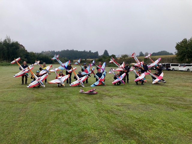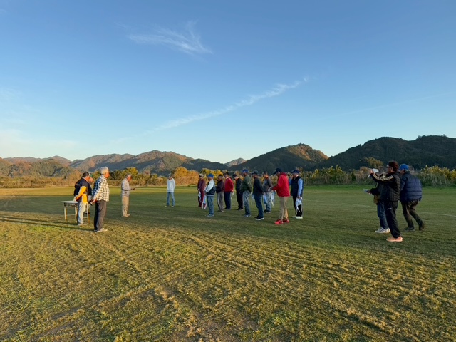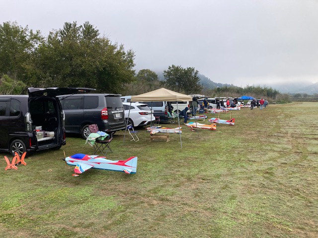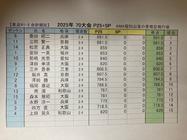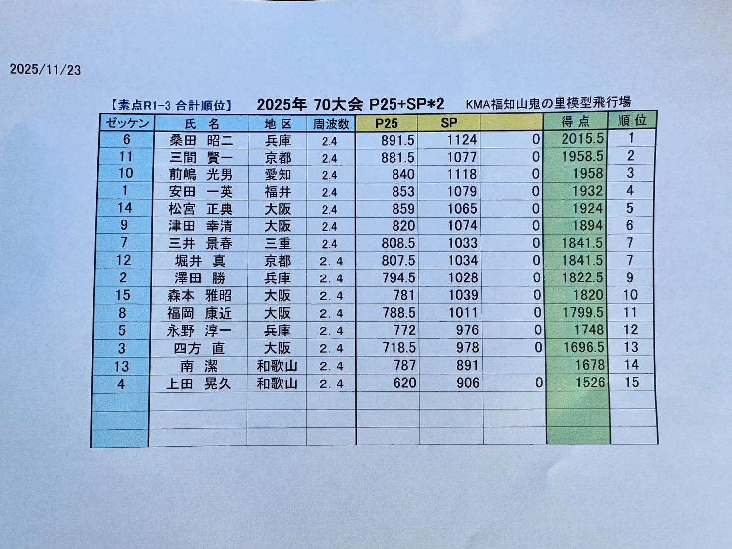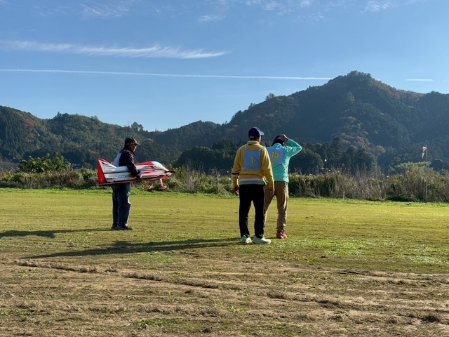 | 2025年 第10回 KMA70曲技競技大会 11月23日 KMA福知山鬼の里模型飛行場 今年の最後となる大会で、さらにP25パターンも最後となる大会となりました。 前日土曜日は、大会準備の為飛行場に行ってみると、5~6名のフライヤーが練習をされていました。お天気は概ね晴れで穏やかな天候でした。明日も穏やかな天候が予想されます。ただ、この時期この地方独特の朝の濃霧が気になります。 当日、大会会場に到着するとやはり濃霧で開会式を済ませ、競技を開始する手はずでしたがウェザーチェックで上空に飛行機を上げたところ雲が低く機体の視認性が確保できない為暫くの待機となりました。競技をスタートできたのは、午前11時くらいとなりましたが、参加者が15名と少数でしたので、何とか日没までに競技が終了できる予定で進行しました。まずは、1ラウンド目は、P25から始めて2ラウンド目はスポーツマンとなります。P25は、ジャッジ2名素点合計が得点となり、スポーツマンはジャッジ3名で素点合計の2倍が得点で、それぞれの合計点で順位が決定されます。スポーツマンの点数配分が大きく順位に影響します。また、スポーツマンのハンディとして、2024年 2025年にF3A日本選手権出場者は離陸後全ての演技(離陸・着陸は正面)を背面で実施するルールが適用されました。このルールが適用された強者が三間選手ただ1人でした。 1ラウンドが終了したのが、午後1時30分くらいでした。この時点での順位は、トップか桑田選手、2位が三間選手、3位が松宮選手、4位が安田選手、5位が前島選手と続きます。2ラウンド目のスポーツマンの得点配分が順位に大きく影響しますので、まだまだ判りません。 いつもの、美味しいランチをいただき2ラウンド目のスタートとなりました。ただ、本日は午前中も穏やかな風で言い訳できないコンディションが続きます。順調に競技は進行していき、午後3時30分くらいにすべての競技者のフライトを終えることができました。 スポーツマン背面エントリー適用を受けた三間選手は2ラウンド目での順位は4位でしたが1ラウンド目の貯金が効いてトータルで2位キープとなりました。総合結果としては、全ラウンドトップの桑田選手が優勝、2位が三間選手、3位が前島選手、4位が安田選手、5位が松宮選手となり無事終了することができました。皆様のご協力のおかげと感謝しております。本当ありがとうございました。 なお、ジャッジとしてご協力頂いた加藤さん、林田 卓さん 集計係として毎回お力を貸していただいている山原さん 藤本さんには、この場を借りてお礼申し上げます。本当にありがとうございました。 文/写真:KMA 曲技委員会 林田 | ||