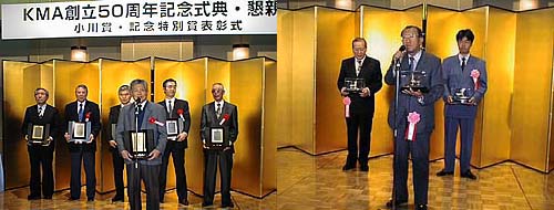 まず、会長挨拶、来賓の方々の祝辞に続いて、KMA50年の運営に多大な御協力を頂いた団体、賛助会への感謝状の贈呈、KMA功労者の表彰が行われました。