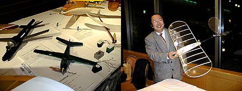 宴の中では、昨年話題をさらった電動室内R/C飛行機が再度飛行を披露し着陸後、大谷会長に贈呈されたあと、さらに小型軽量化された新作機が小さな丸テーブルの上から離着陸、さらに宙返りをも成功させ、会場に展示された往年の名機から格段に進化した模型の歴史を目の当たりにした参加者から、驚きと大きな喝采を浴びました。