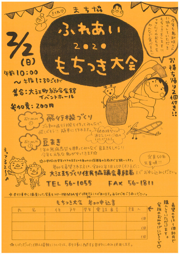 2020年2月2日、KMAでは福知山鬼の里模型飛行場が立地する地元の「大江まちづくり住民協議会」さんが主催された「ふれあい2020もちつき大会」へ協賛させていただきました。