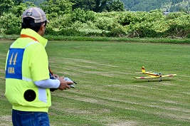 クラス1では、危険時の回避のためにエレベーターの装備を認めていますが、左手平で送信機の裏を保持して、エレベーターを操舵していませんと、アピールする操縦スタイルが印象的です。飛行する機体の姿から伝わる魅力は、未経験者にとっては新しいラジコン飛行機の分野に映るようで、好奇心感じる反響から次回からの参加者が増えそうです。